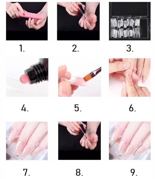 A műköröm alját vékony rétegben kend be poly géllel, majd ragaszd a körmödre. Szárítsd meg LED-lámpa alatt, majd a műkörmöt egyszerűen távolítsd el.